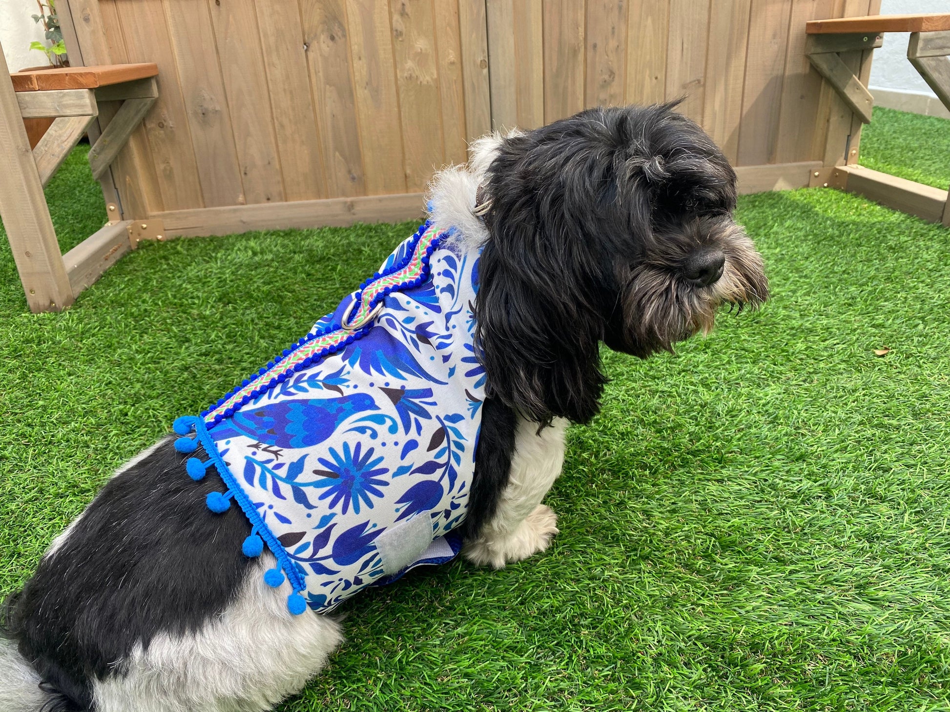 This is a dog harness with traditional Mexican colors and patterns with a velcro closure and quick release buckle.
